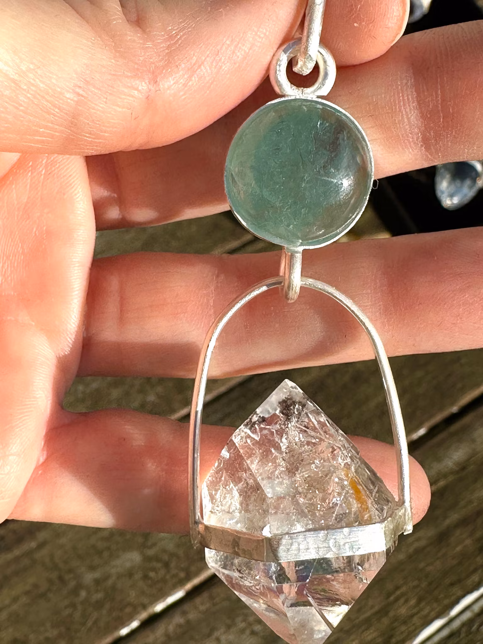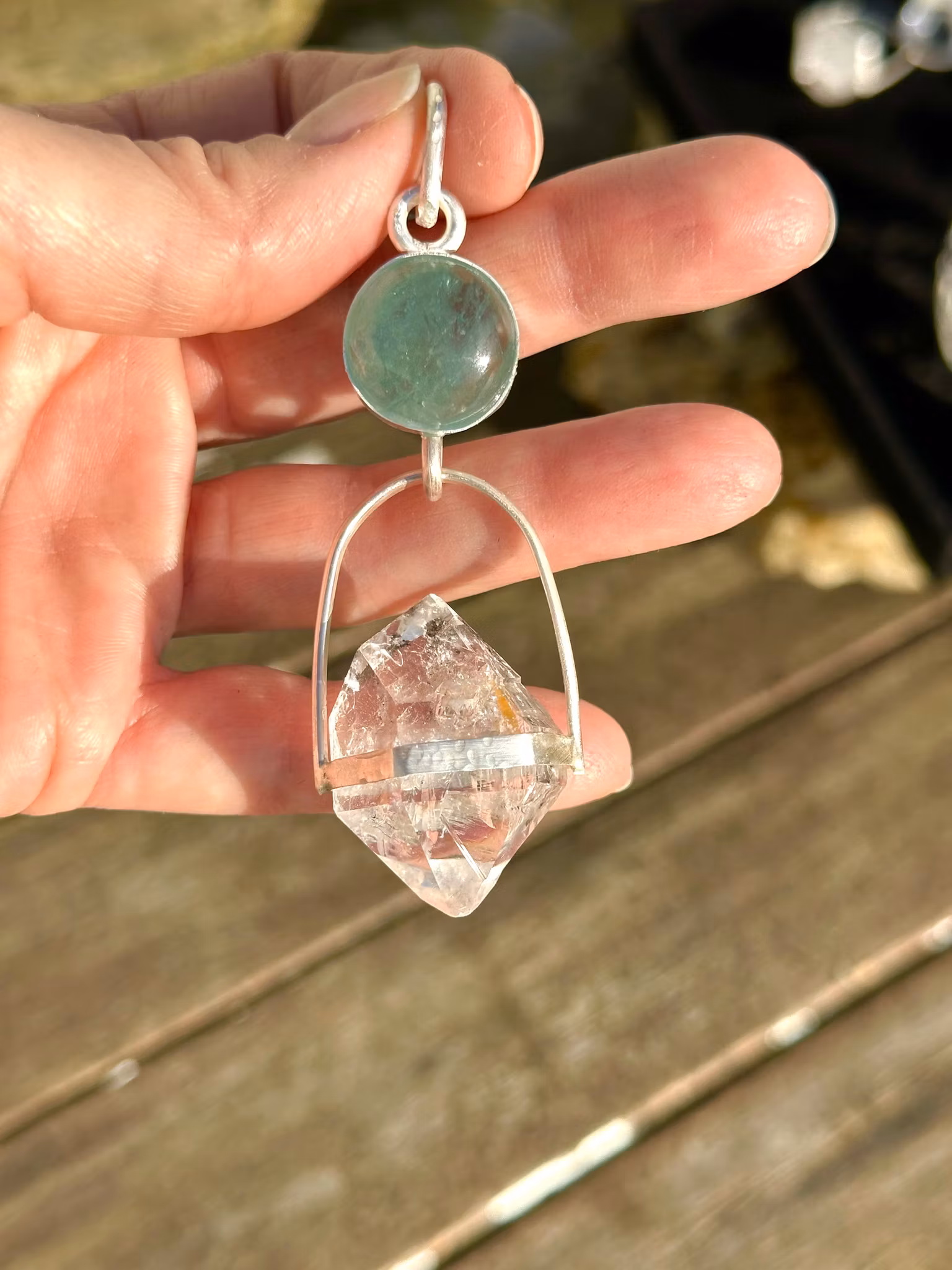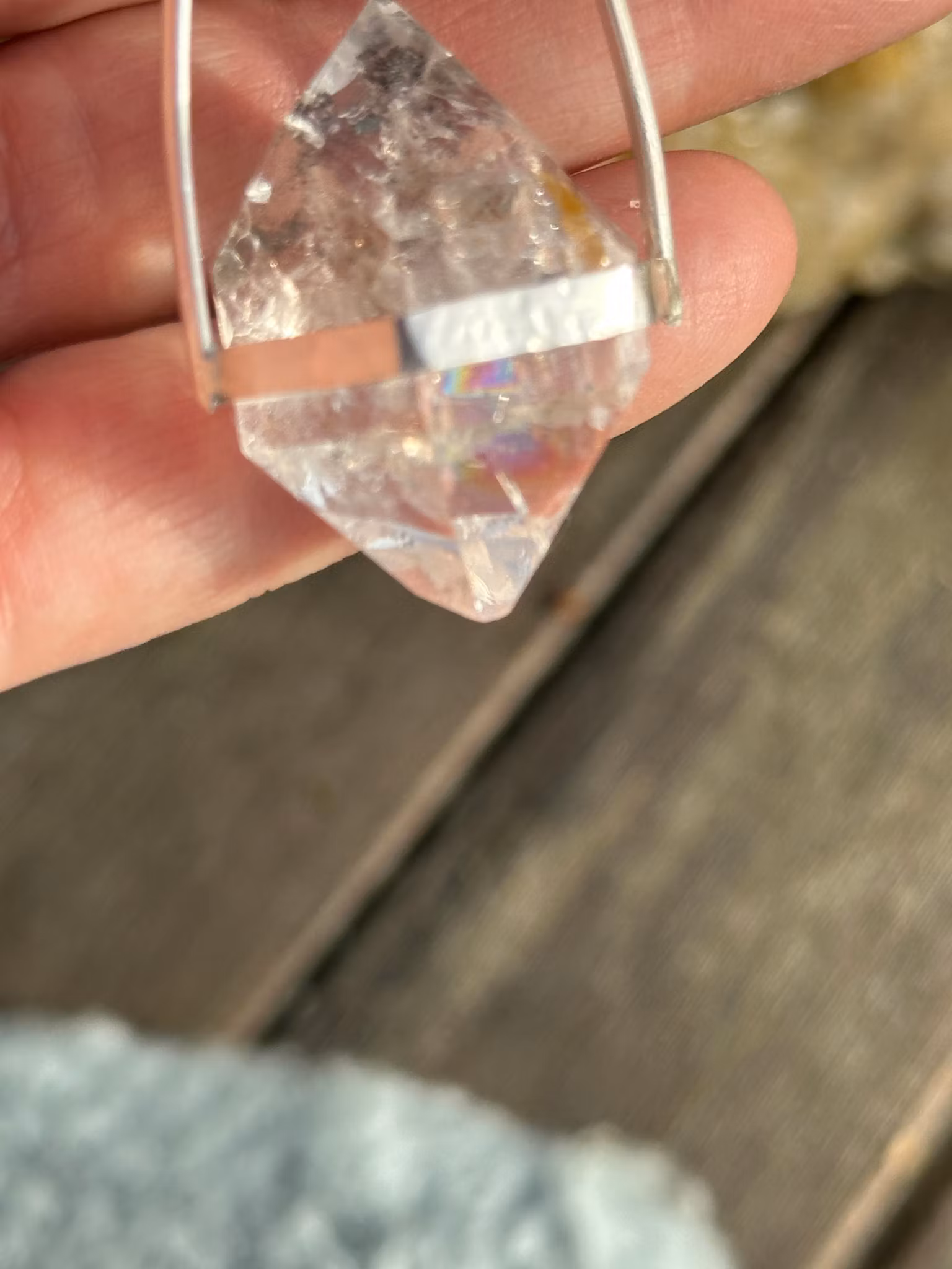 The Herkimer Diamond, blazing with internal rainbows, acts as the crystalline receiver.