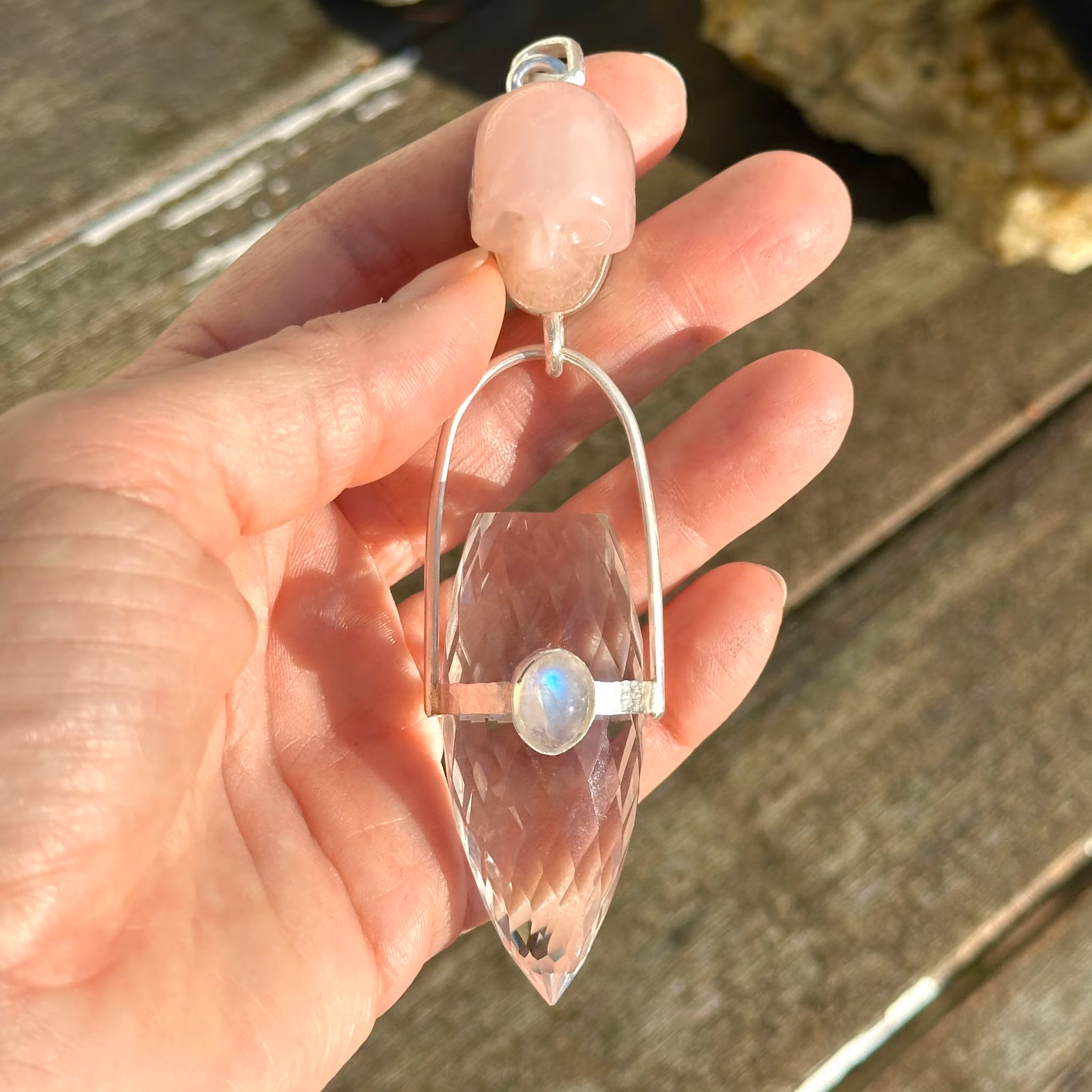 Rose Quartz Skull with High Frequency Dragon Egg & Rainbow Moonstone