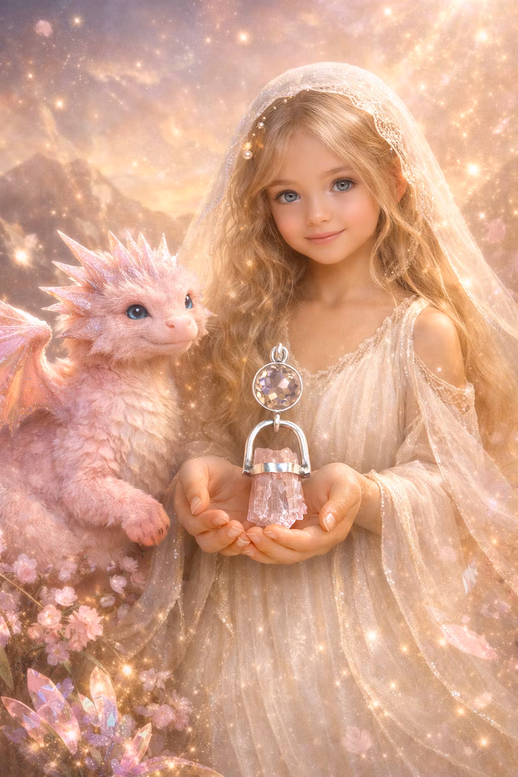 A small light being appears — the daughter of Mary Magdalene — radiant, serene, untouched by distortion. Beside her, a soft pink dragon pulses with living heart-light, a guardian of purity, a keeper of innocence.