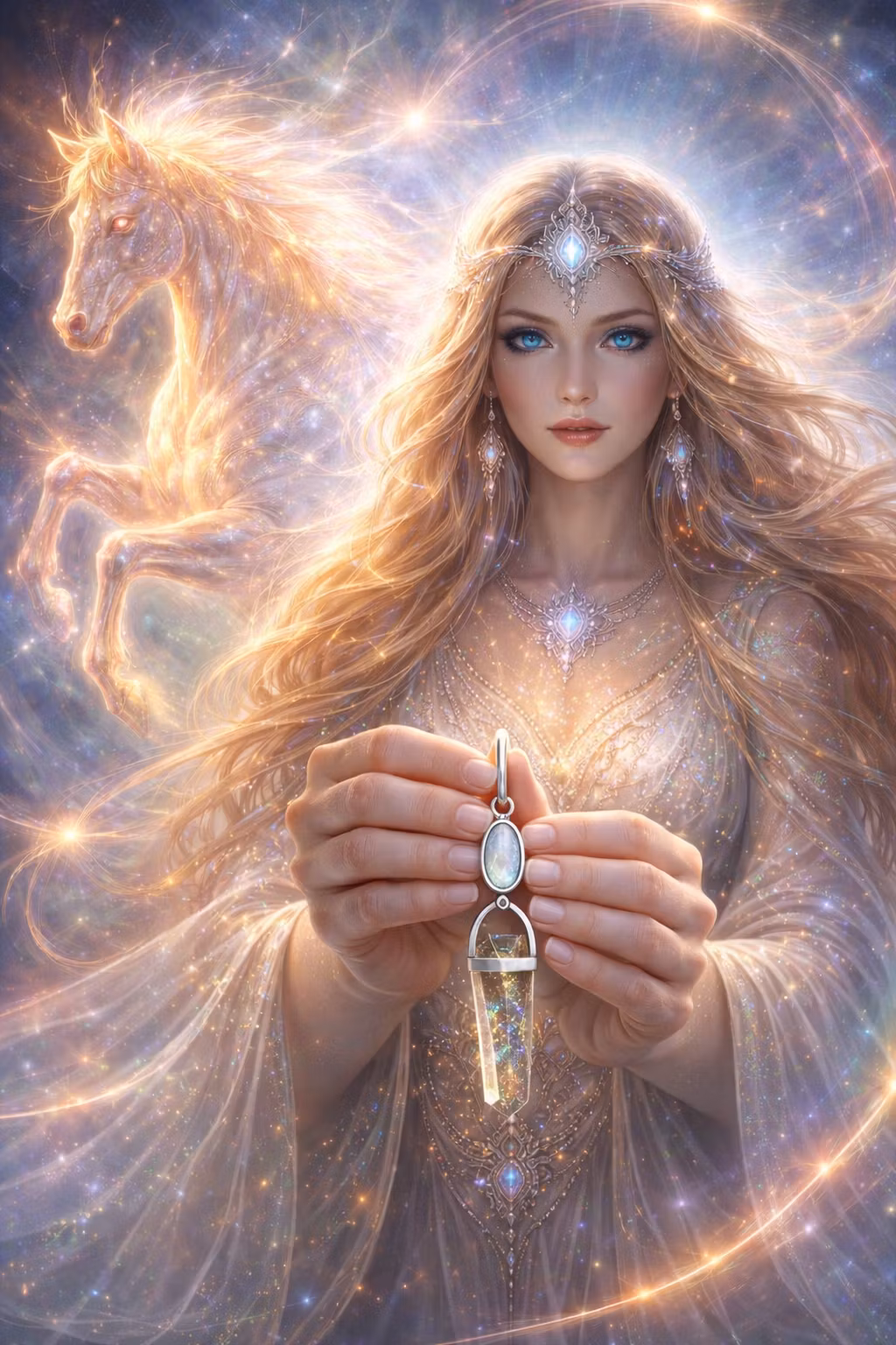 Light shimmers around her like living stardust, and her eyes — piercing, ancient blue — hold the memory of all that has ever been.