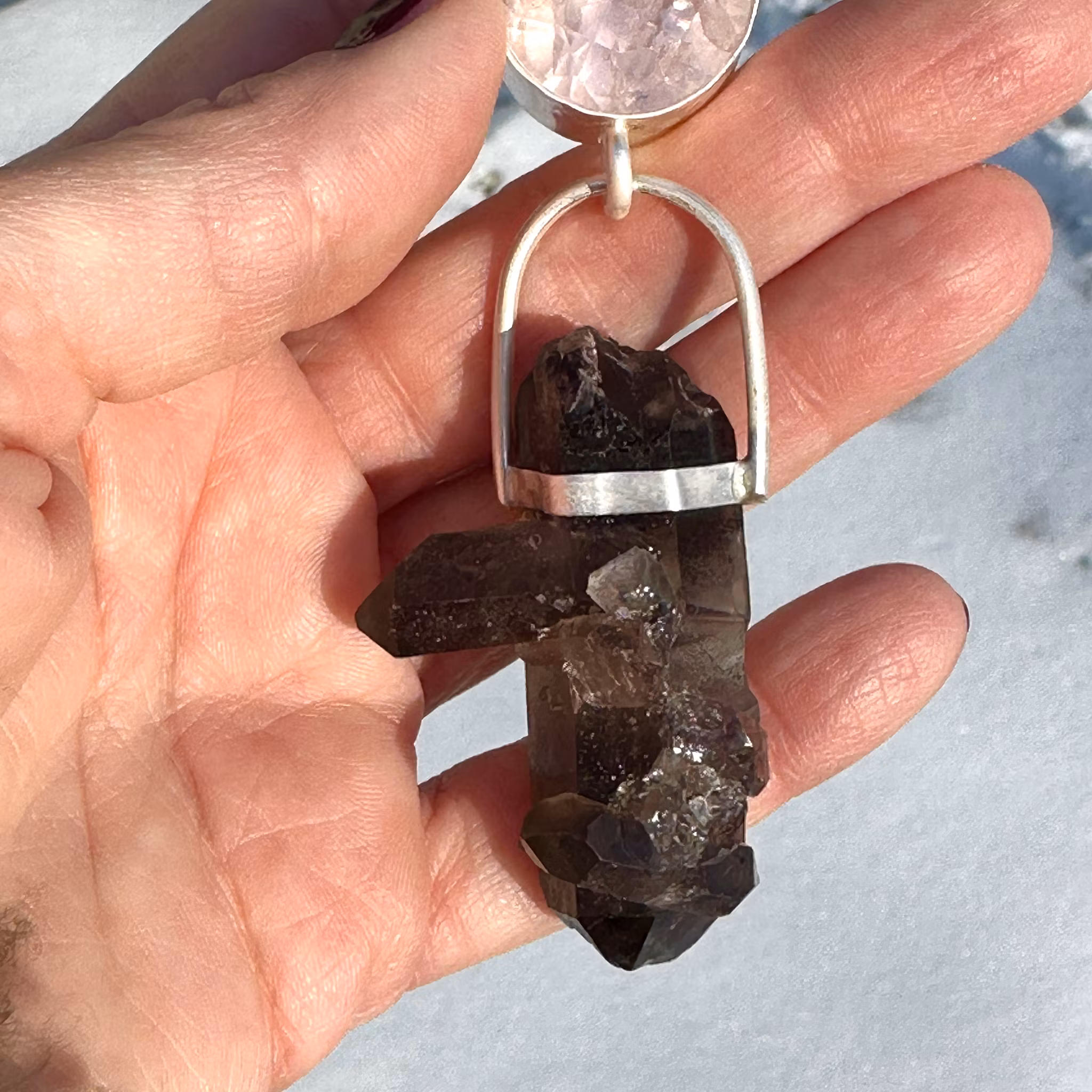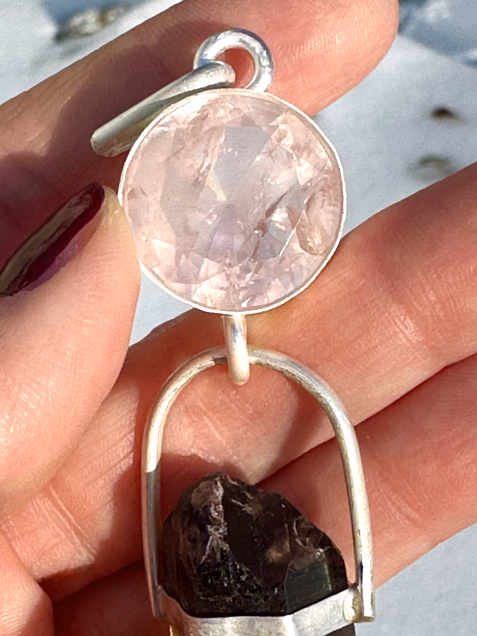 Rose Quartz with naturally double terminated Smokey Quartz with pendant crystals