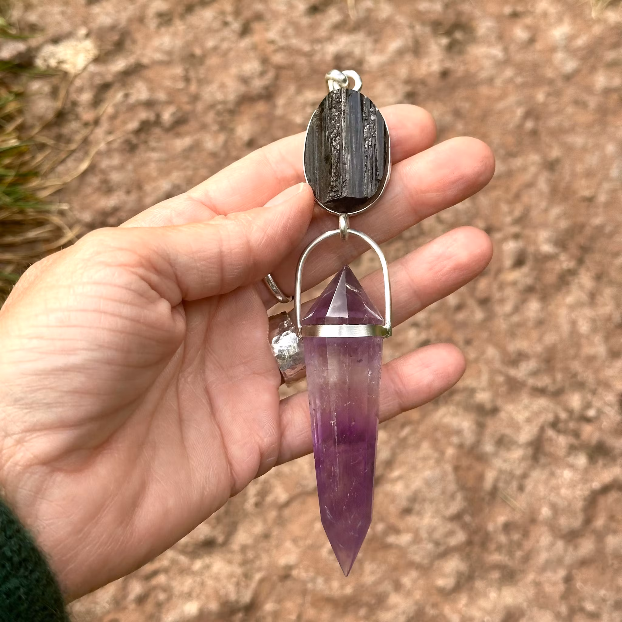 Wand of Kali- masterpiece Black Tourmaline with Amethyst Vogel crystal